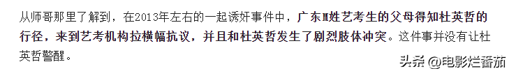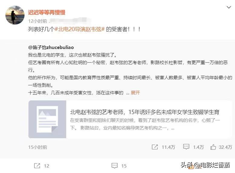 事情还没有完,9月19日晚,一位自称是北京电影学院学生的施姓网友在看到这篇文章后,又写下了另一篇文章,剑指赵韦弦艺考时的老师,影路站台艺考的校长杜英哲。