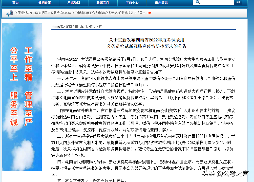 关于重新发布湖南省2022年度考试录用 公务员笔试新冠肺炎疫情防控要求的公告