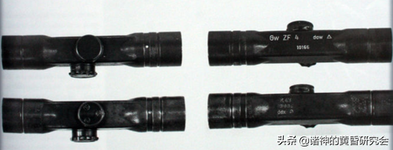 两款不同的Zf4瞄准镜,上方为早期型,德军制式名为Gw ZF4,即“4倍步枪用瞄准镜”(Gewehr Zielfernrohr 4-fach),由位于捷克斯洛伐克普热罗夫市的光伏技术公司(Opticotechna G.m.b.H)生产,编号dow。下方为战争后期由奥地利维也纳的福伦达光学仪器厂(Voigtländer)生产,编号ddx,注意小三角记号的颜色代表了狙击镜不同的使用气象环境,白色代表常温区,蓝色代表极寒条件,绿色代表热带。