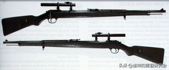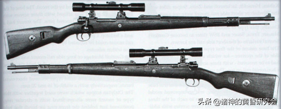 一把斯太尔兵工厂(Steyr)生产的K98k狙击步枪,配光学技术公司的4倍瞄准镜。狙击镜以同心调整环安装,通过调节固定在物镜周围的圆环来进行横向调整。由于这种双钩型支架的狙击步枪大量配发给党卫军,所以也称为“党卫军钩支架”