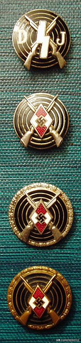 二战期间的希特勒青年团射手奖章(Hitler Jugend Schiessauszeichnungen),根据成绩不同分为4档,如图从上到下分别是:希特勒少年团射手(总共颁发28万枚)、青年团射手(约28万枚)、s神射手(约3.2万枚)和王牌射手(约900枚)