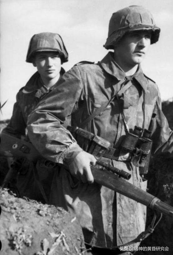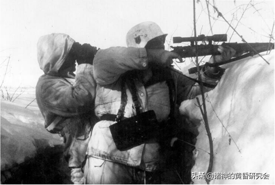 苏联前线上一个典型的德军二人狙击小组,一人射击,一任观察
