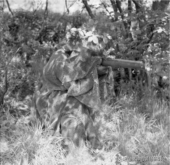 1944年7月27日在法国村庄的一所狙击学校里,一名英军士兵身穿党卫军悬铃木迷彩罩服在进行演示,目的是让学员们识别德军狙击手的装束