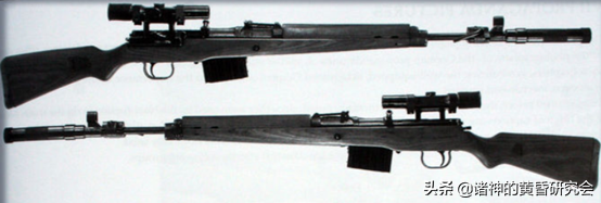 两种不同的瞄准镜,上面的是采用高底座的阿雅克(Ajack)6倍镜,下面为短底座的卡尔.蔡司(Zeiss Zielvier 4×81)4倍镜