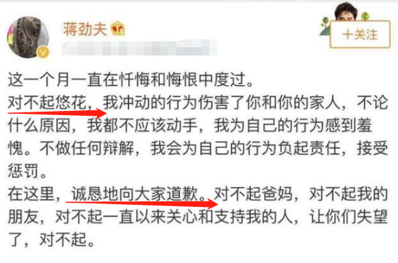 舆论发酵之后,蒋劲夫公开承认家暴,称:“这一个月一直在忏悔和悔恨中度过。对不起悠花,我冲动的行为伤害了你和你的家人,不论什么原因,我都不应该动手,我为自己的行为感到羞愧。”