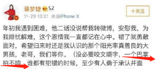 当时娱乐圈一众明星还站出来力挺蒋劲夫,尤其是女星蒋梦婕,还发文称:“一个巴掌拍不响”,有意在将错误归在受害的女方身上,并说谁都不是圣人,总得有改过自新的机会。