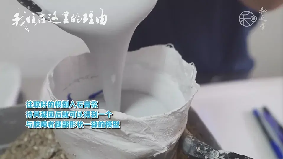 往取好的模倒入石膏浆,待其凝固后,就可以得到一个与肢障者腿部形状一致的模型。