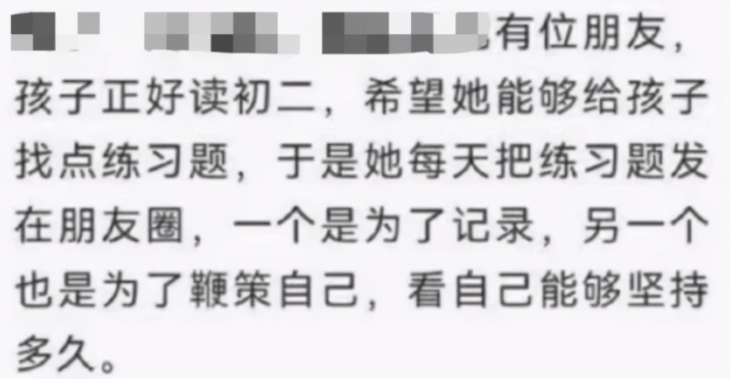 上海一中学的数学老师,在朋友圈为自己亲戚家的学生发布了数学试题,一来为了督促自己不要忘了,二来也打卡记录。久而久之,班级里的家长们发现,老师发布的试题正是老师所教的学生初二的,而且老师也会发答案和解释。
