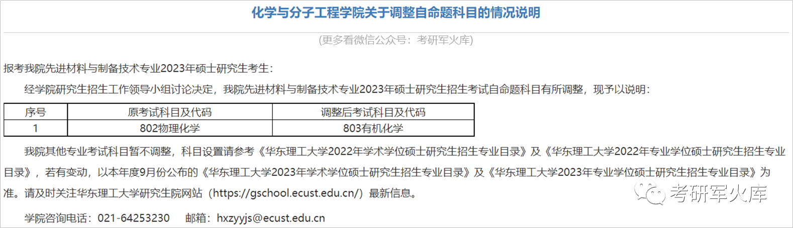 先进材料与制备技术专业初试自命题科目由“802物理化学”调整为“803有机化学”。