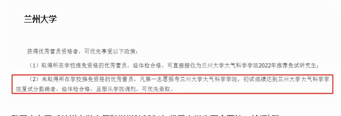 参加兰州大学夏令营活动的学生,获得了优秀营员的学生可以直接免试入学上研究生,而没有获得优秀营员的学生,初试过线并且第一志愿是兰州大学就可以免复试直接到大气科学学院攻读研究生。