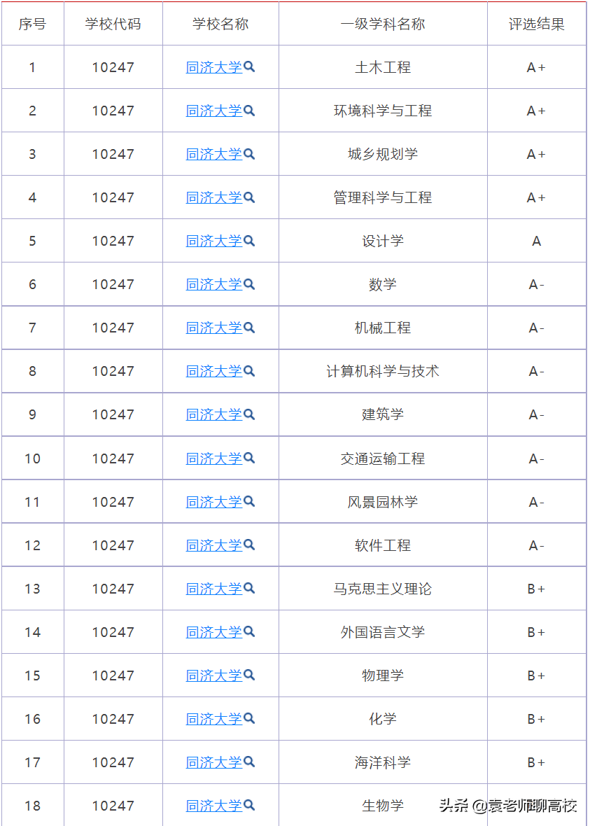 在第四轮学科评估中,同济大学有4个学科被评为A+,分别是土木工程、环境科学与工程、城乡规划学和管理科学与工程,A-以上学科有12个,具体可见下图!