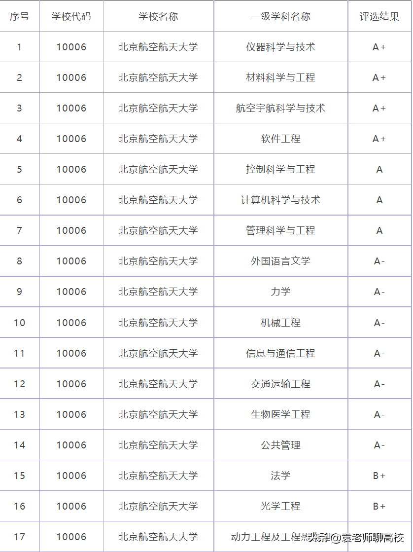 在第四轮学科评估中,北京航空航天大学有四个学科被评为A+,分别是仪器科学与技术、材料科学与工程、航空宇航科学与技术和软件工程等4个学科,其中A-以上学科有14个,具体可见下图!