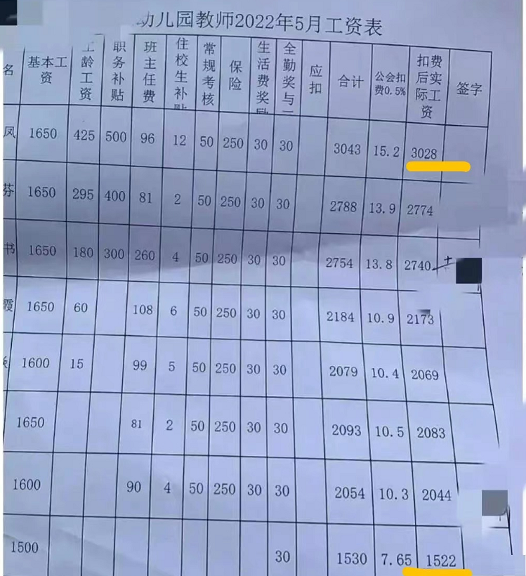 某家幼儿园的老师晒出了集体工资单,看完叫人意外。光是看第一位老师,虽然不算高,但是就这一行业的平均水平而言,也还算正常。