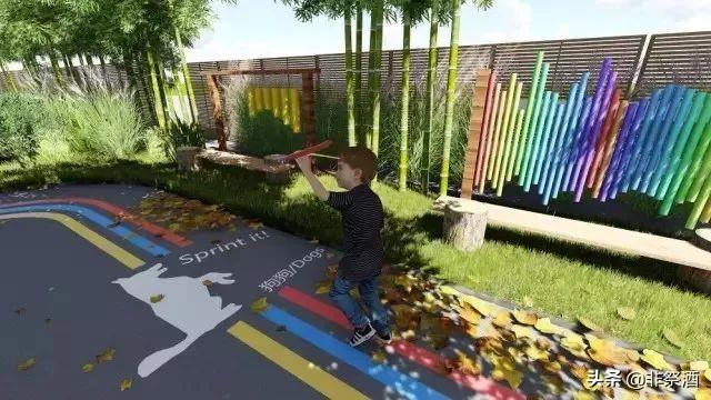 地面的彩色线条,既能带领孩子们学习交通安全知识,也是孩子们自己的游玩路线。一旁的彩色风铃也使孩子们五感得到训练。