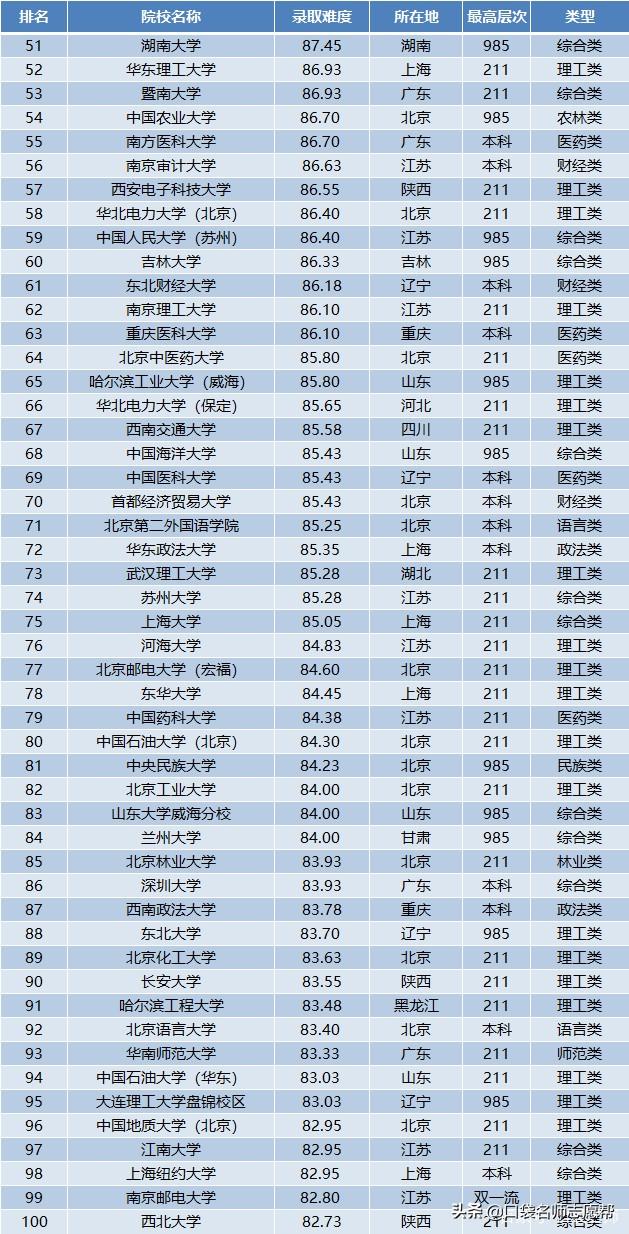 一是该校的推免人数,还有所占比例;二是复试分数线,我国考研有国家线和34所高校自划线,无论是哪一种,分数高低决定了考研难度的大小;三是复试比例,复试比例越大,考研的风险越大。今天小编为大家整理了,全国100所高校考研难度排行榜,快来看看有你想要报考的学校吗?