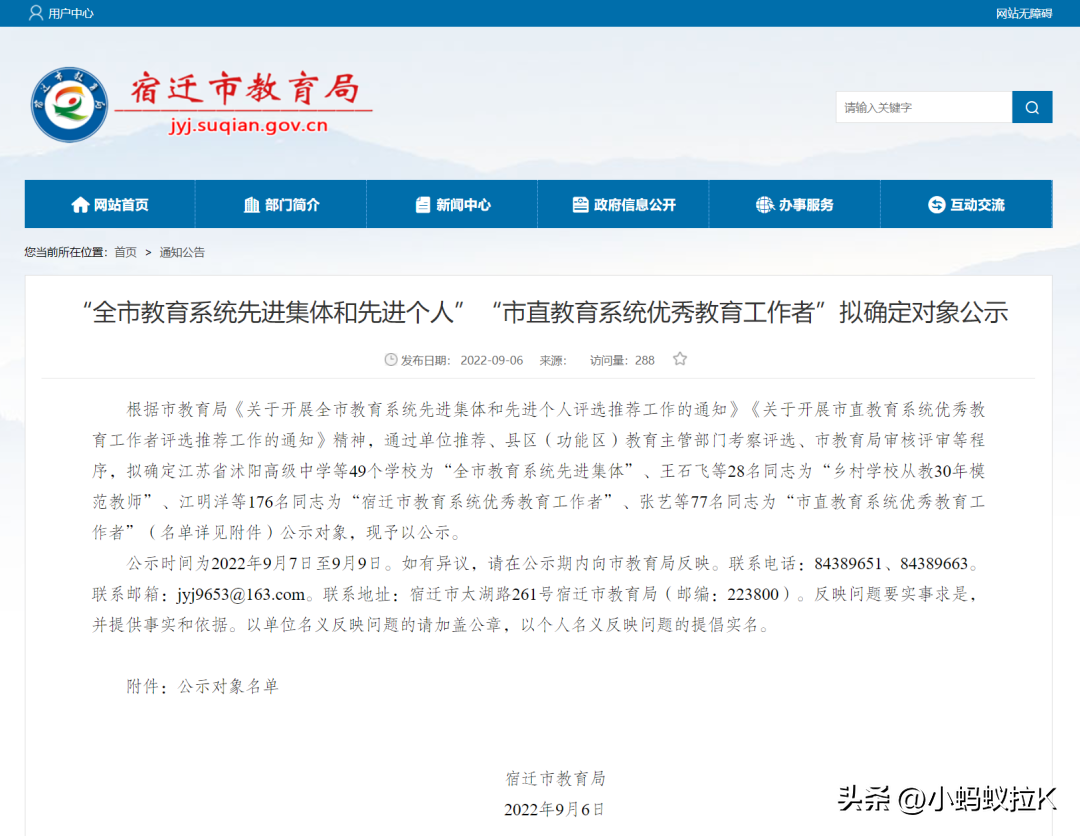 拟确定江苏省沭阳高级中学等49个学校为“全市教育系统先进集体”、王石飞等28名同志为“乡村学校从教30年模范教师”、江明洋等176名同志为“宿迁市教育系统优秀教育工作者”、张艺等77名同志为“市直教育系统优秀教育工作者”。