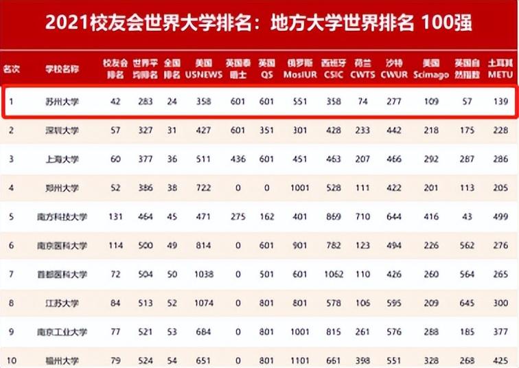 2021年,全国第三方大学评价机构艾瑞深校友会网正式公布《2021校友会世界大学排名分析报告》,苏州大学雄踞2021中国地方大学世界第1名。