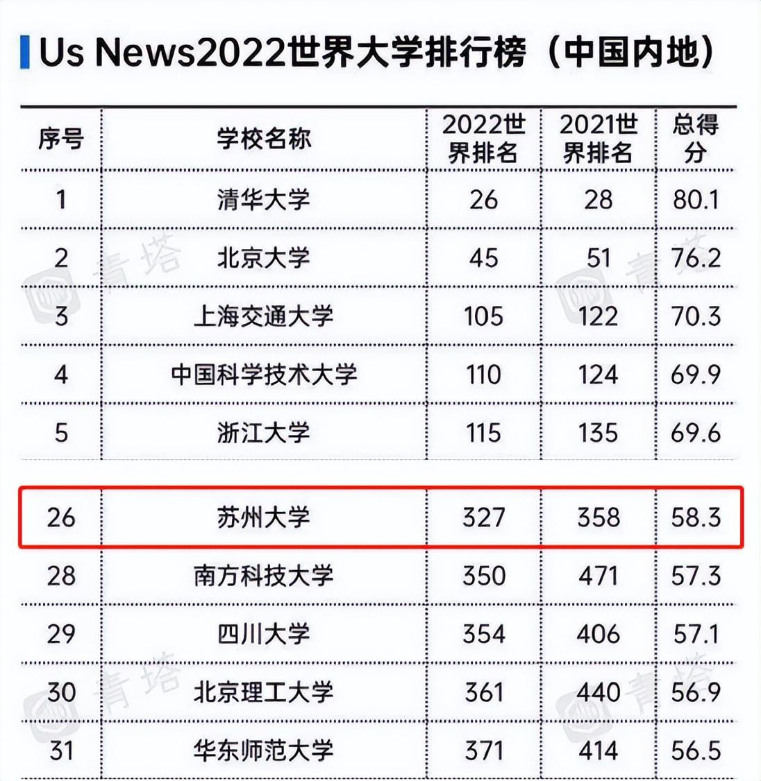 在US News2022世界大学排行榜中,苏州大学位居中国大陆高校第26名,且世界排名比2021年上升31位。