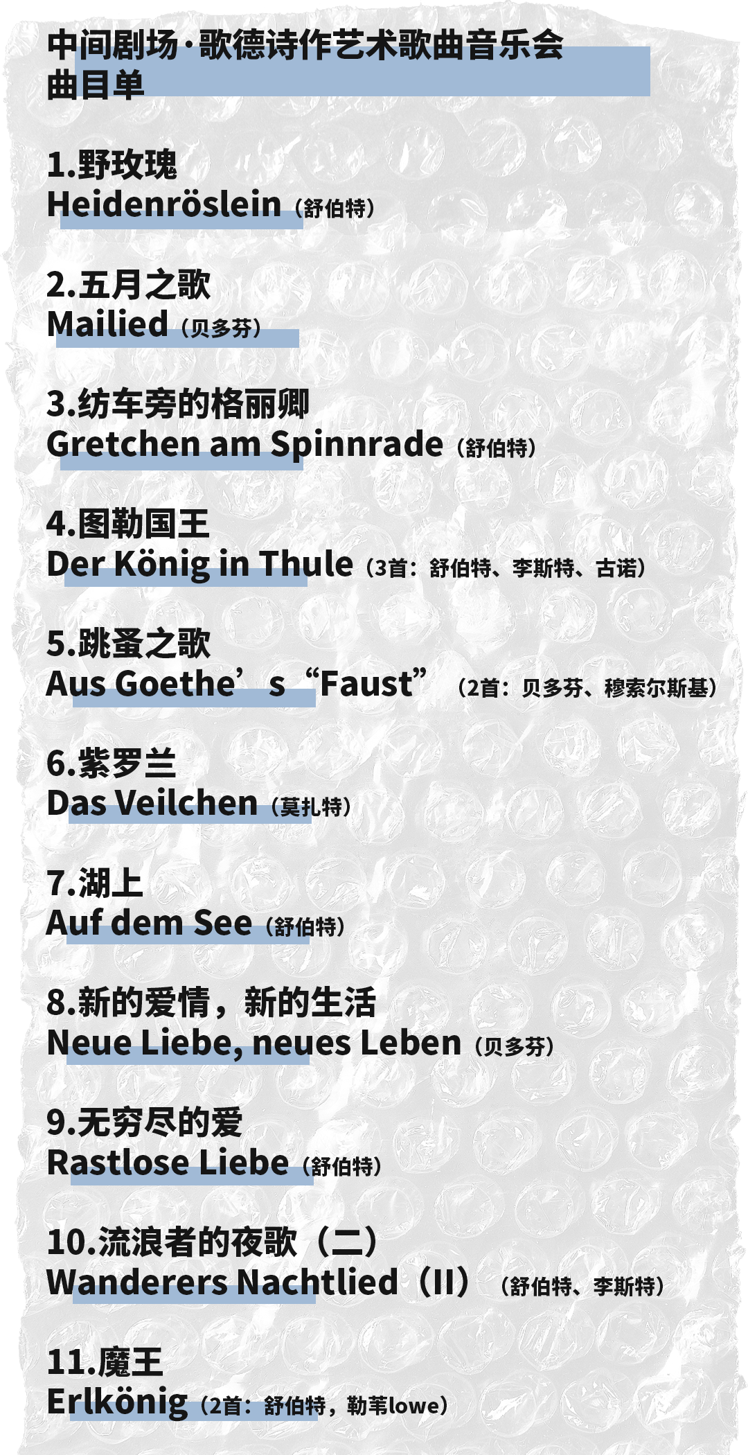 9月17日下午,在北京秋日午后的中间剧场,让我们投入这一张用歌德诗作艺术编织起的浪漫音符的“罗网”,在优美而赋有韵律的德语诗歌里,共同领略这位两百多岁的伟大诗人无休止的爱,不谢幕的歌。