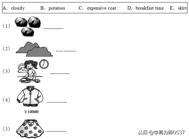 (5)图片是一条短裙,选项E短裙,可知图片与选项E相符,故答案为E.