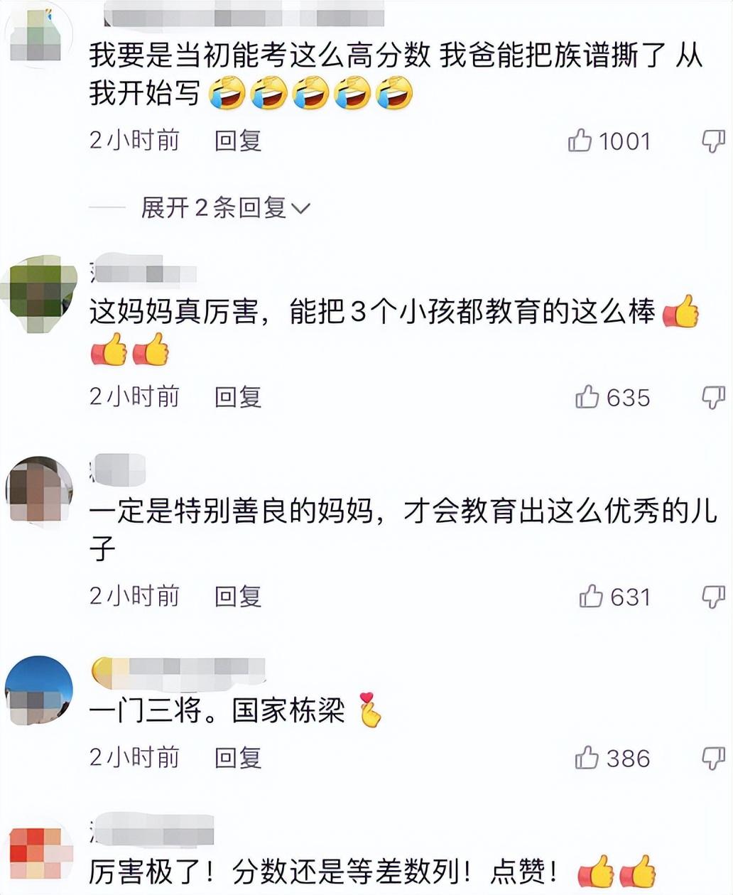 网友对此也纷纷表示:这位母亲真是太伟大了,能把3个小孩都教育得这么出色!还有的网友表示:妈妈将来就等着享福吧!但在一众夸赞的声音之余,还有的网友评论酸味十足,直言表示:努力有什么用,还不是个小镇做题家?