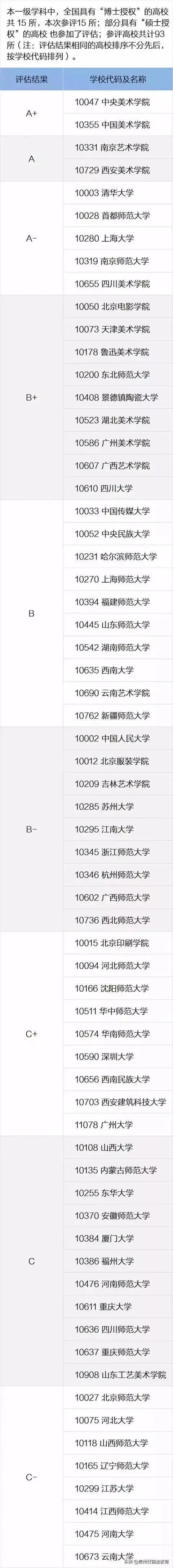 全国美术学学科第四轮评估结果如下: