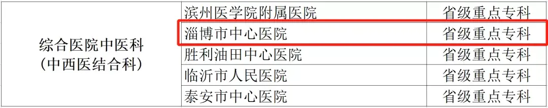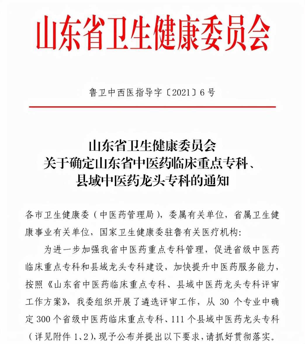 2021年底,在山东省卫生健康委员会下发的《关于确定山东省中医药临床重点专科、县域中医药龙头专科的通知》中,淄博市中心医淄博市中心医院中医科(中西医结合正骨科)获评“山东省中医药临床重点专科”。