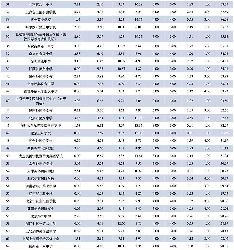 北京和上海为两个上榜学校最多的区域,且均为18所。分析这两个区域的上榜学校,会发现北京上榜的学校当中,只有7所私立学校,且排名最高的私立学校为35位。上海则有12所私立学校上榜,占到总数的2/3,且上海私立学校排位比较靠前,最高的为上海世界外国语中学,名列第六位,也是私立学校排位最前的学校。另外两个直辖市,即天津和重庆,在上榜学校数量上表现平平。
