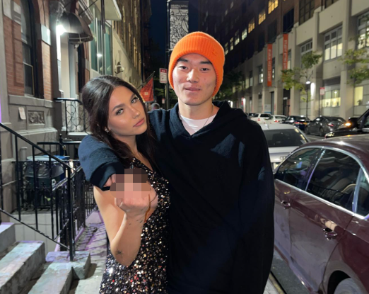 照片中,林子濠一身西装,高大帅气。他抱着自己的洋人女友,两个人相互依偎,画面温馨。