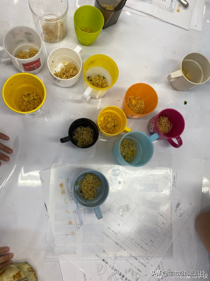 ▲一个班的孩子在用豆奶做冰激凌,既有数字的学习,同时也有语言的学习,因为要读做冰激凌的方子。还有一个班级在做拉面,要了解盐分对食物味道的影响。还有的孩子在称量橡皮泥,学习克的概念。