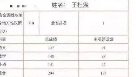 四川成都石室中学考生张家杰以718分的成绩获得理科状元,其中,语文133分,数学150分,英语148分,理综287分。他的双胞胎哥哥张家豪获705分,张家豪还是詹姆斯的球迷。