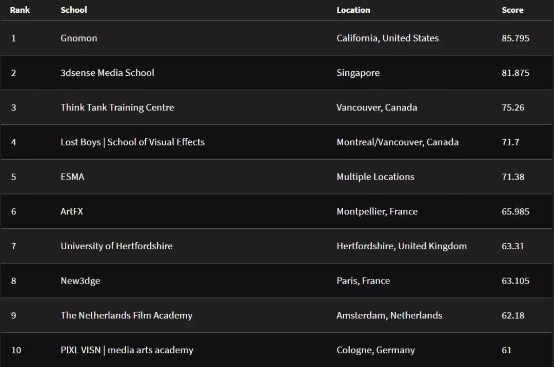 除了众多个人奖项,The Rookies还评选出了2019年动画、游戏、视觉特效等领域的院校团队作品奖项:Production Excellence,并基于各院校参赛学生作品的综合质量和表现,评出了各专业的世界顶尖院校排名。