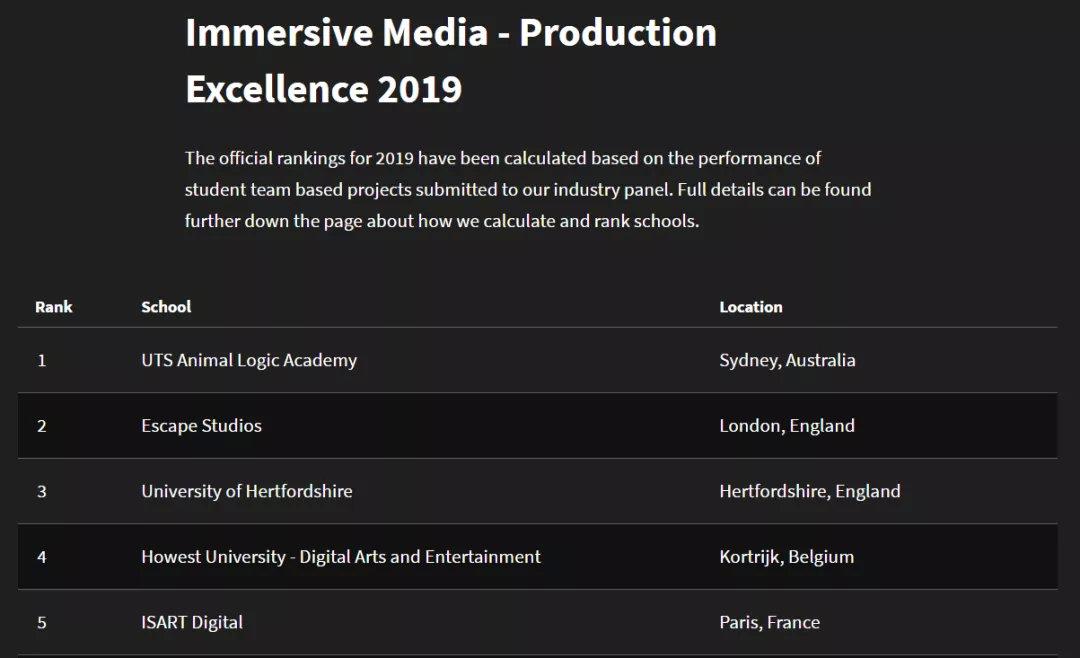 “Immersive Media – Production Excellence”沉浸式媒体制作最佳院校世界第3!