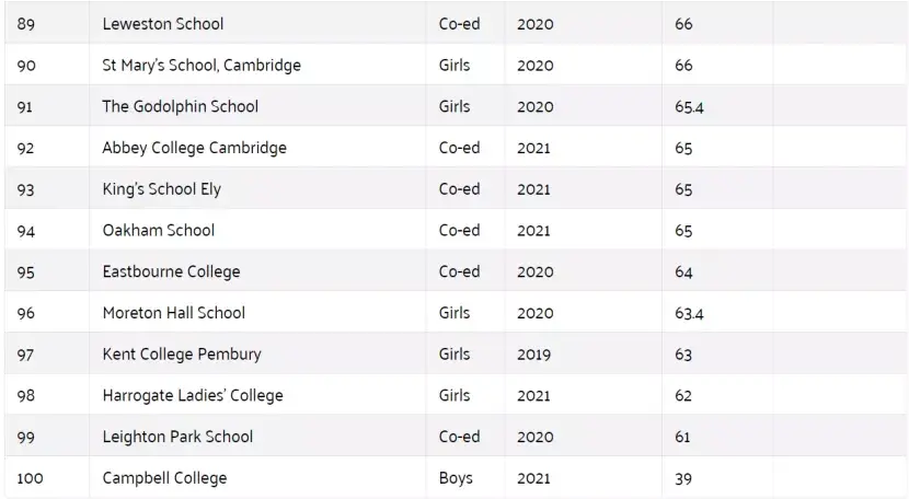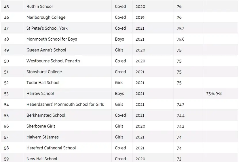 根据GCSE成绩9-7分(A*-A),排名前100的英国寄宿学校名单