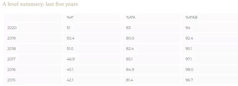 在2020年,A-level考试中,51%的学生取得A*或同等成绩,而83%的学生取得A*-A的成绩。