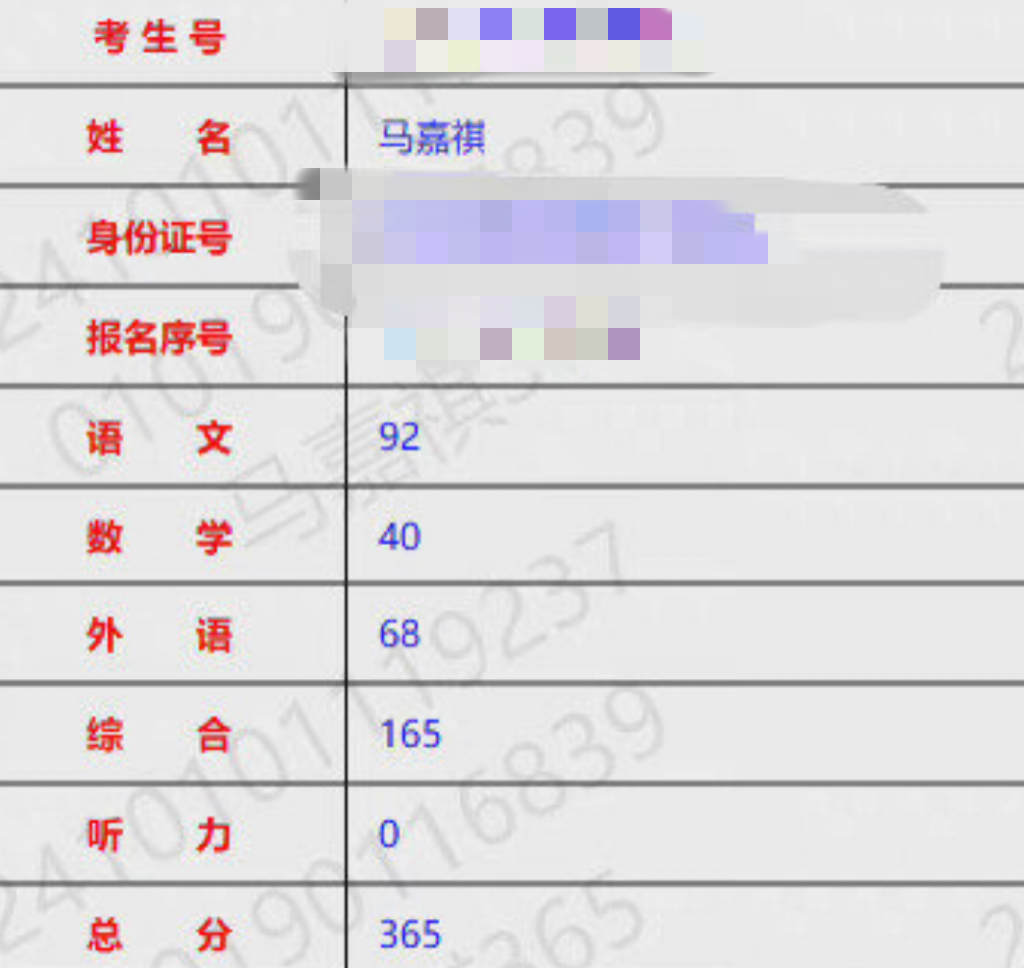但好在马嘉祺的语文和文综成绩还不错,尤其是文综,接近两百分,所以最终总分是365分。
