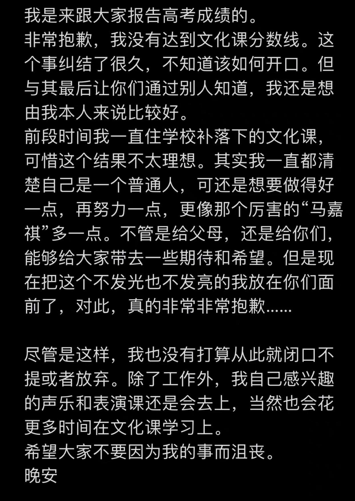 后来,马嘉祺发文道歉,称自己在高考前一直在补文化课,但结果还是不理想,未来将会花更多时间去学习。