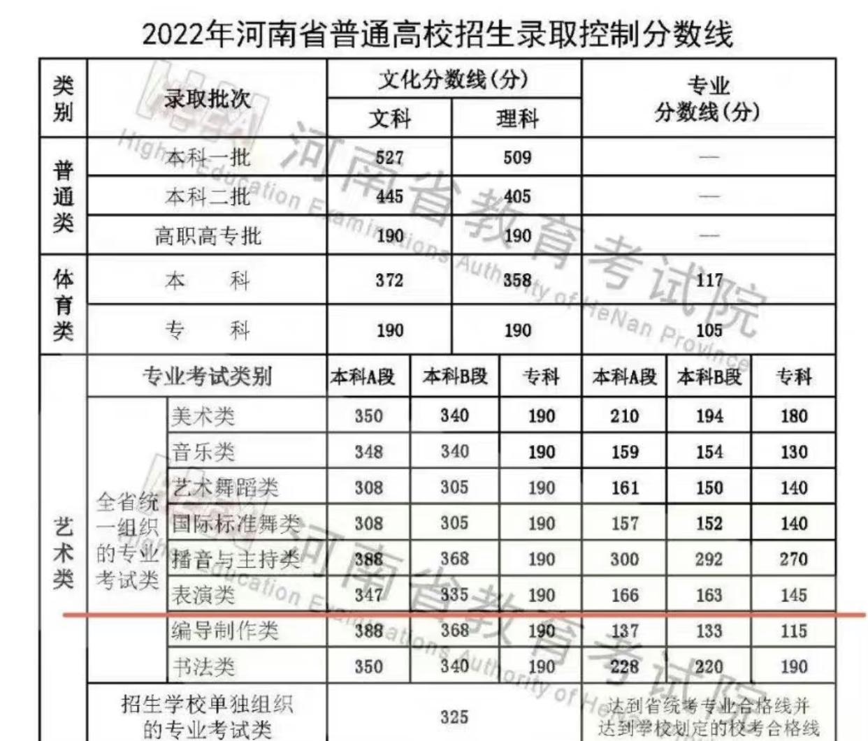 在河南省普通高校招生录取控制分数线一表中,可以看到:艺术类表演专业本科A段是347分。