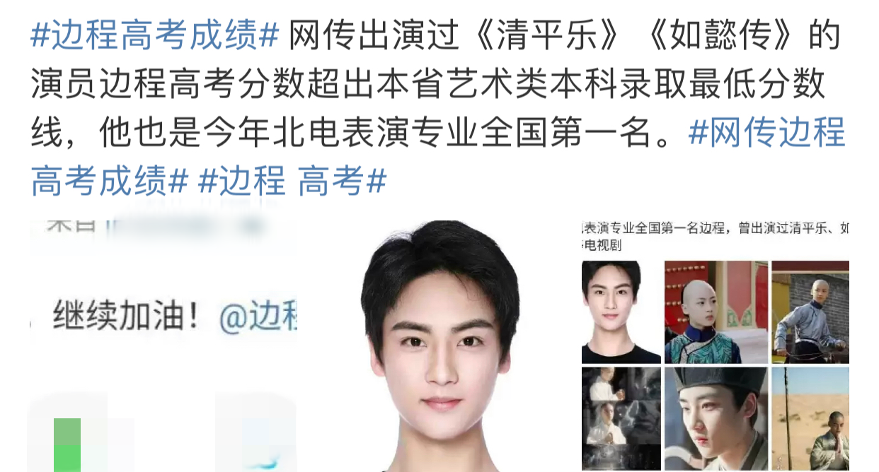 网传边程文化课成绩超出河北省艺术类本科录取线,并且还超了很多分。此前他拿到了北京电影学院表演专业第一名的好成绩,如果文化课过线,那么就会稳上北电。