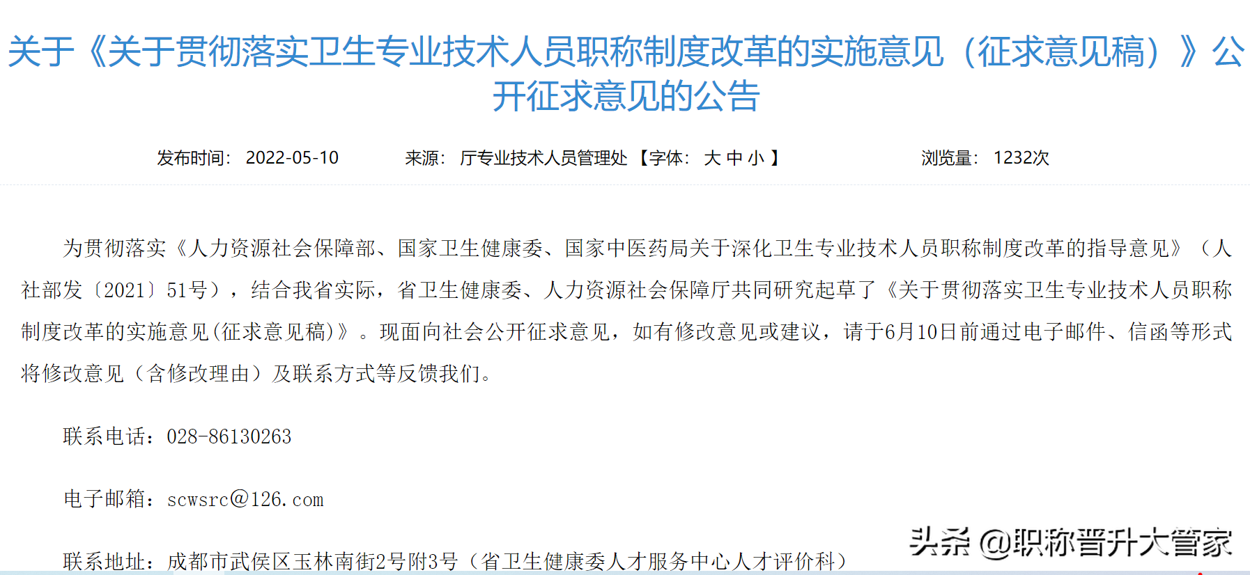 近日,四川省发布卫生专业技术人员职称制度改革的实施意见(征求意见稿),对相关最新政策有指导性意见的,可以通过电话、邮件或直接到省卫生健康委人才服务中心人才评价科进行反馈,时间截至6月10日。