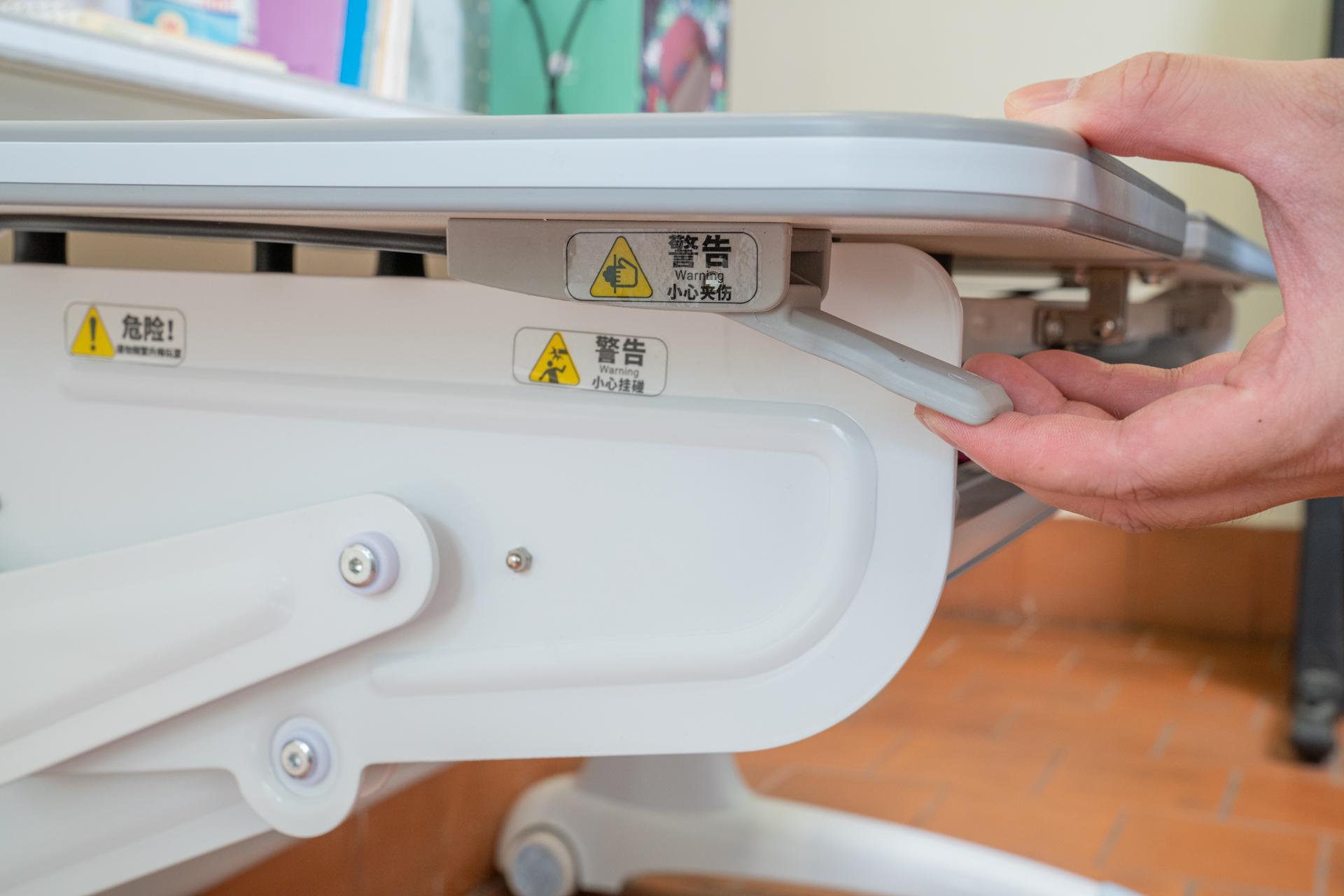 按压调整高度的左按钮后,可以利用气动式机械臂调整桌面的高度,单手按压松开手就即停,这样很容易就能找到自己合适高度。
