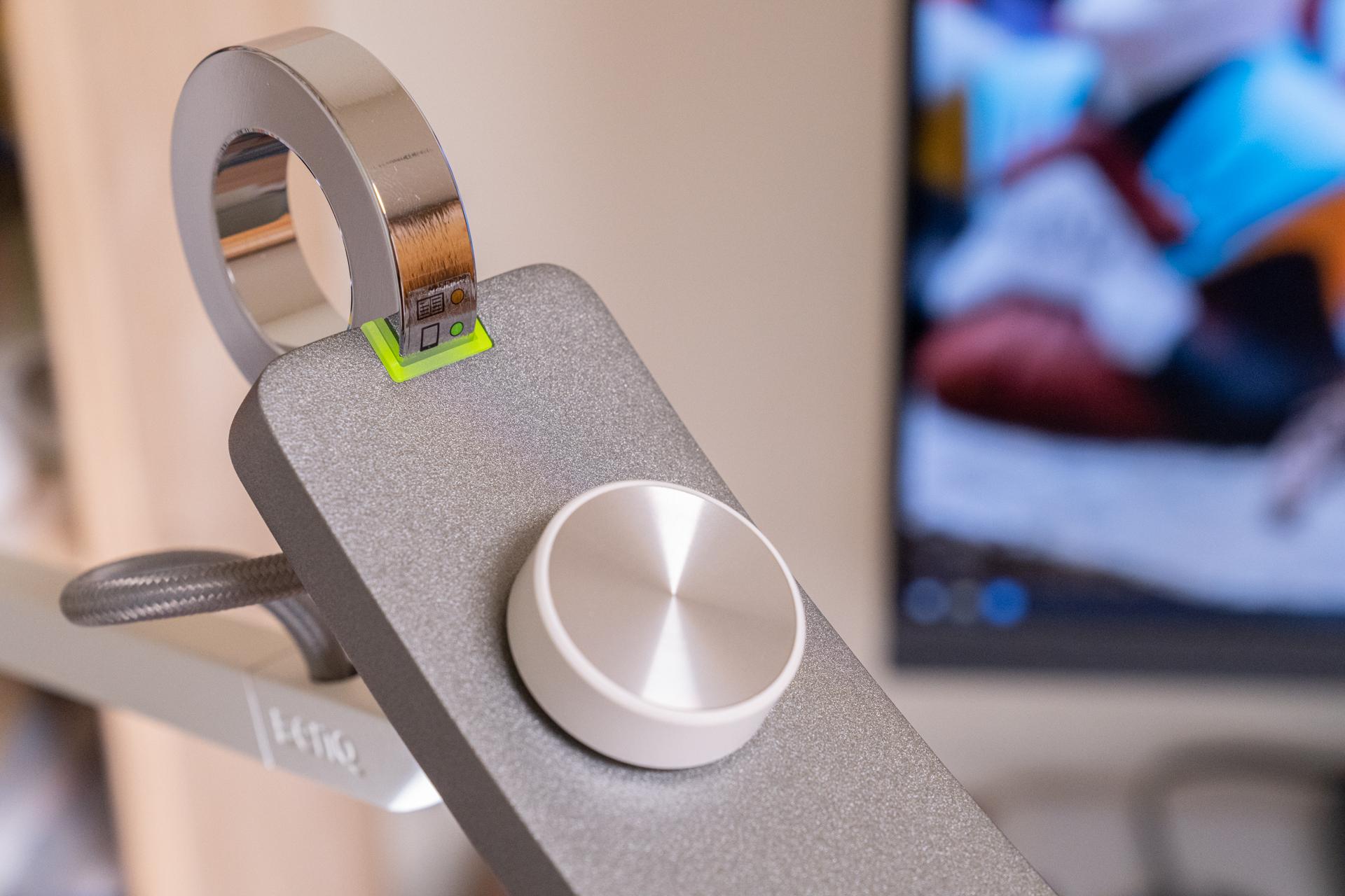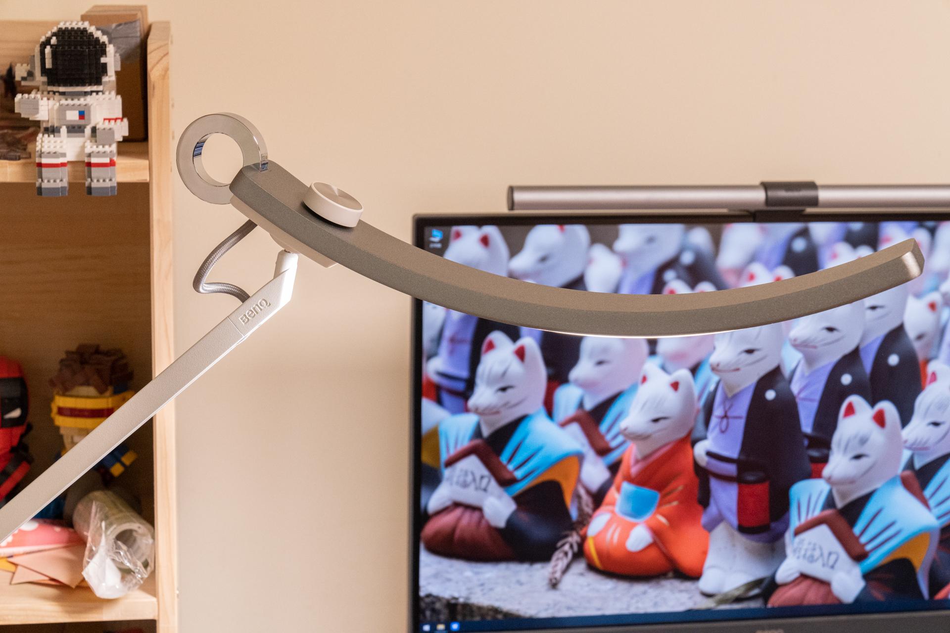 明基 WiT Floor的操控也很简单,采用了金属圆环触摸 + 飞梭旋钮调节 相结合的方式。灯头尾部的金属圆环就是控制明基 WiT Floor的开关,通过触控开关灯,非常的便捷。它还支持长按2秒来切换灯光模式,绿色指示灯亮为屏幕模式,红色指示灯亮为书本阅读模式。当开启屏幕模式的时候,色温会变低,并且中间区域的LED灯也会熄灭,用来降低屏幕反射眩光;当开启书本阅读模式的时候,色温会边高,并且全LED灯点亮,用来满足大范围的照明需求。这两种智能模式下,明基 WiT Floor会根据环境照度自动调节光源亮度,从而达到一个合适的照度水平。