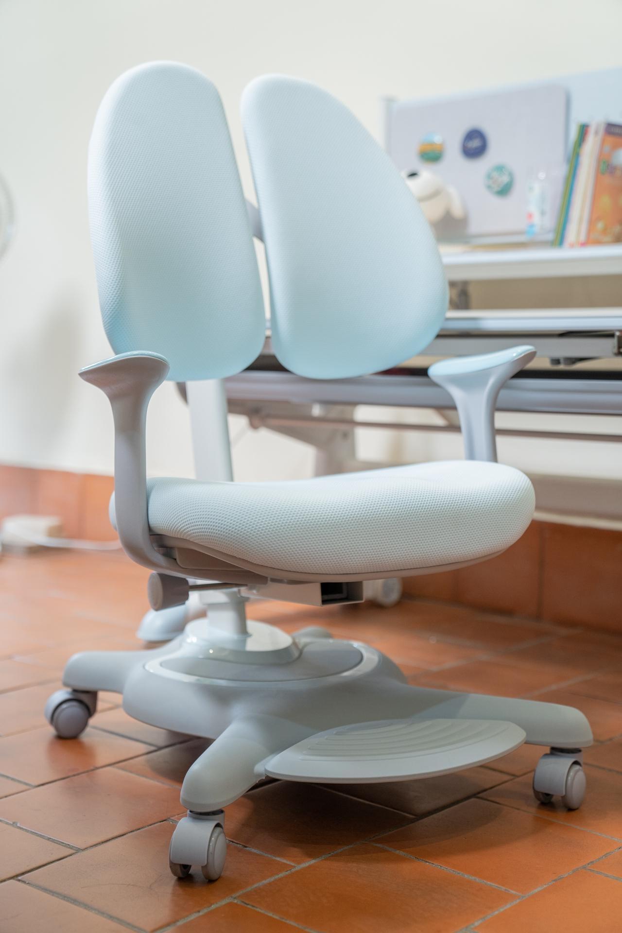 配套的学习椅,这款椅子最大的亮点就是坐姿引导,遵循人体工学设计标准:在孩子学习的时候能让背部和椅子的靠背贴合,培养良好的坐姿习惯。靠背、坐垫均可实现高度调节:坐高支持38-58cm调节、靠背支持50-70cm调节。带有重力自锁轮,当孩子坐上椅子的时候,重量≥20kg,轮子就会自动锁定,不管如何晃动都可以让椅子保持不动,这样的设计能让孩子更加专注学习。当人离开椅子后,椅子没有受到重力,就会解锁,解锁后轮子是可以360°自由旋转。让孩子找到最舒适的坐姿,让孩子不知不觉习惯正确坐姿,在舒适的环境学习,同时也在健康的环境成长。