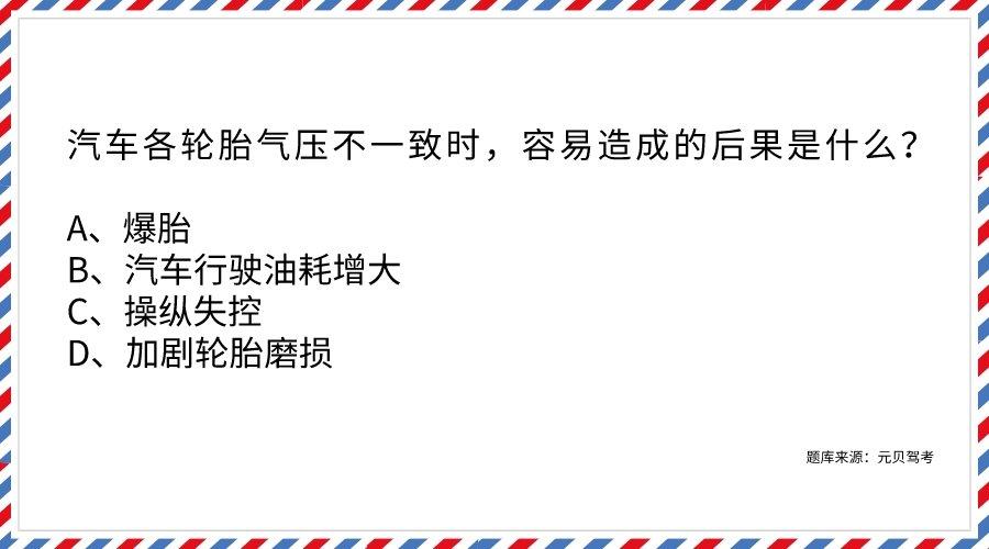 官方解析:车辆的轮胎气压不足或左右两侧轮胎气压不均匀时,会引起制动效果存在时差,导致操纵失控,转向困难或转向沉重,同时也降低了轮胎的使用寿命,导致容易爆胎、增大油耗,因此答案为ABCD。