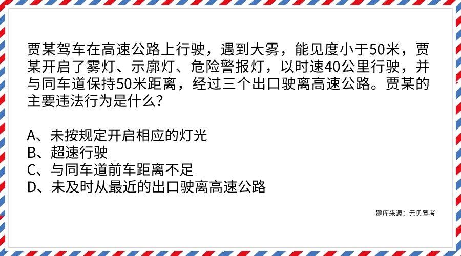 元贝提醒:很多学员疑惑的C选项,在大雾天气能见度低于50米时,首要任务是尽快驶离高速公路,贾某与前车保持50米车距开车,本身已经违反了“驶离高速公路”的规定,因此车距已经没有意义。