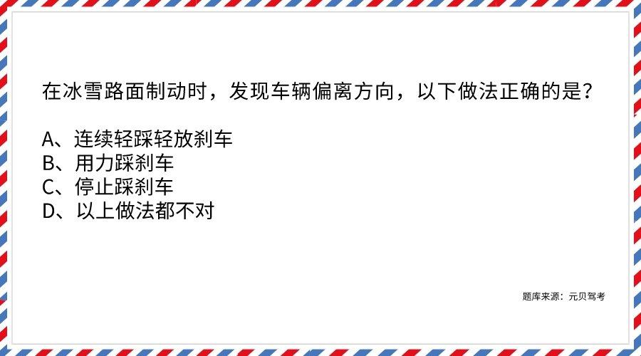 官方解析:连续轻踩轻放刹车和用力踩刹车都是错误的。在这种情况下,立即踩制动踏板极易引起侧翻,正确做法是先握紧方向盘,不要紧急踩刹车。因此本题选C。