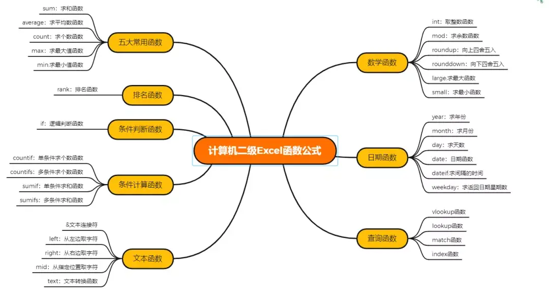 在计算机二级office操作题部分,最难得部分莫过于Excel的操作部分,那Excel中最难得就是函数的使用,小虎以脑图的形式帮大家整理出了常考的函数,记得要点赞收藏哦!!!