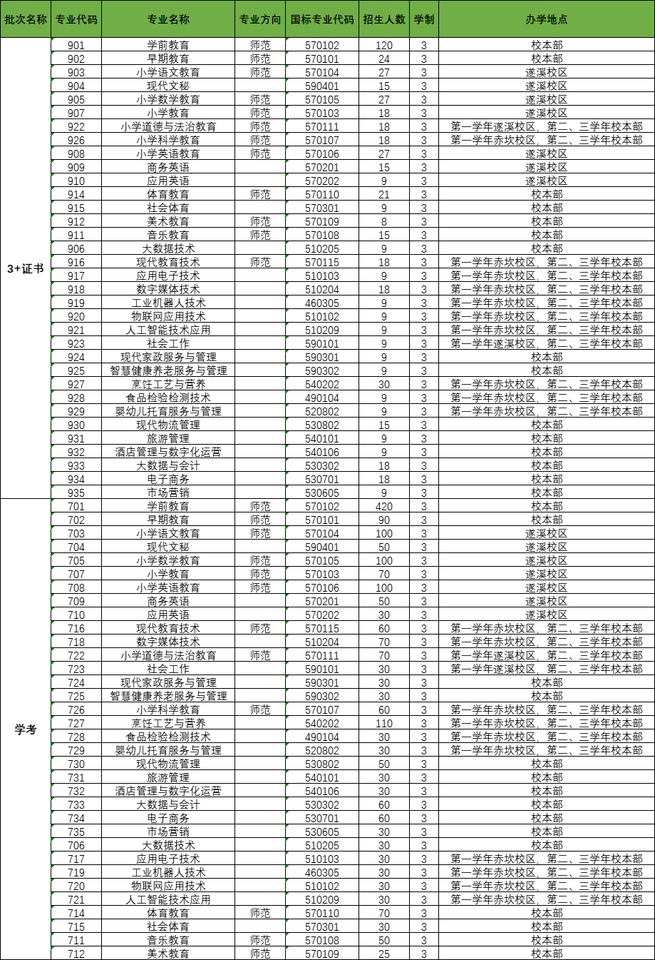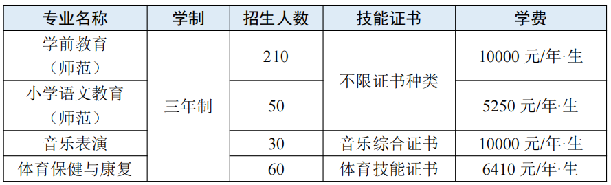 首批开设具有教师教育特色的学前教育、小学语文教育2个专业和体育保健与康复、音乐表演两个非师专业,均面向3+证书高职高考招生。