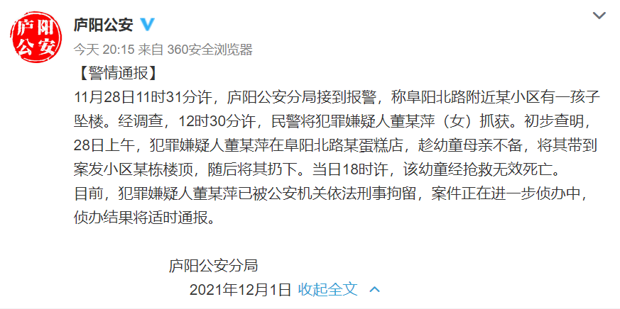 12月1日20点15分,据安徽省合肥市公安局庐阳分局官方微博消息,11月28日11时31分许,合肥市庐阳公安分局接到报警,称阜阳北路附近某小区有一孩子坠楼。经调查,12时30分许,民警将犯罪嫌疑人董某萍(女)抓获。初步查明,28日上午,犯罪嫌疑人董某萍在阜阳北路某蛋糕店,趁幼童母亲不备,将其带到案发小区某栋楼顶,随后将其扔下。当日18时许,该幼童经抢救无效死亡。