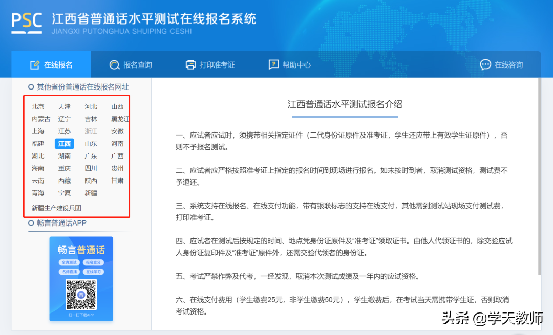 作用:基本上全国各的省市都可以在这里进行普通话的报名,只要在左上方红框选择自己的省市即可。